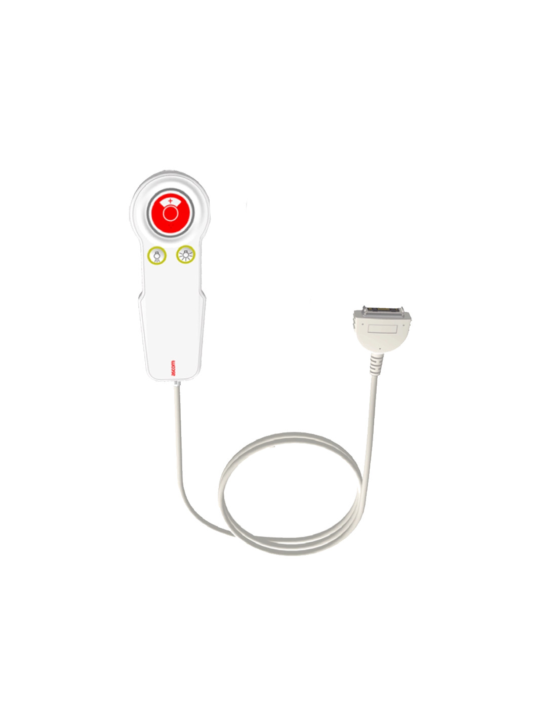 Le manipulateur NIPH2 est de couleur blanche. Il est muni d'un grand bouton rouge d'appel rétro-éclairé avec led de tranquilisation et il a aussi 3 points pour faciliter l'identification pour les non voyants.