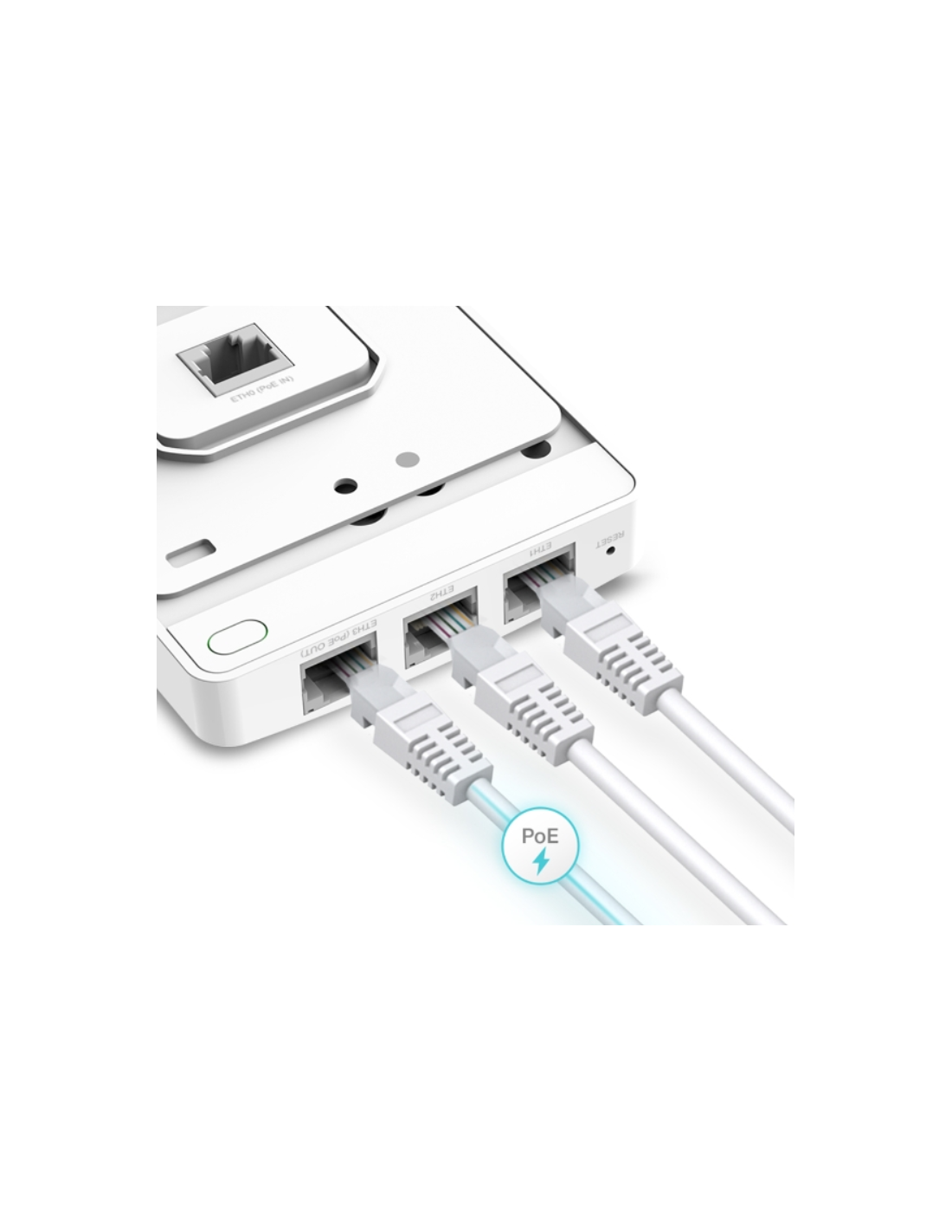 AC1200 Wall-Plate Dual-Band Wi-Fi Access Point PORT: Uplink: 1× Gigabit RJ45 Port; Downlink: 3× Gigabit RJ45 Port SPEED: 300 Mbps at 2.4 GHz + 867 Mbps at 5 GHz FEATURE: Compatible with EU & US Standard Junction Box, 802.3at/af PoE, PoE Passthrough, 2× Internal Antennas, MU-MIMO, Band Steering, Beamforming, Load Balance, Centralized Management by Omada SDN Controller , Omada App, 143 × 86 × 19.7 mm